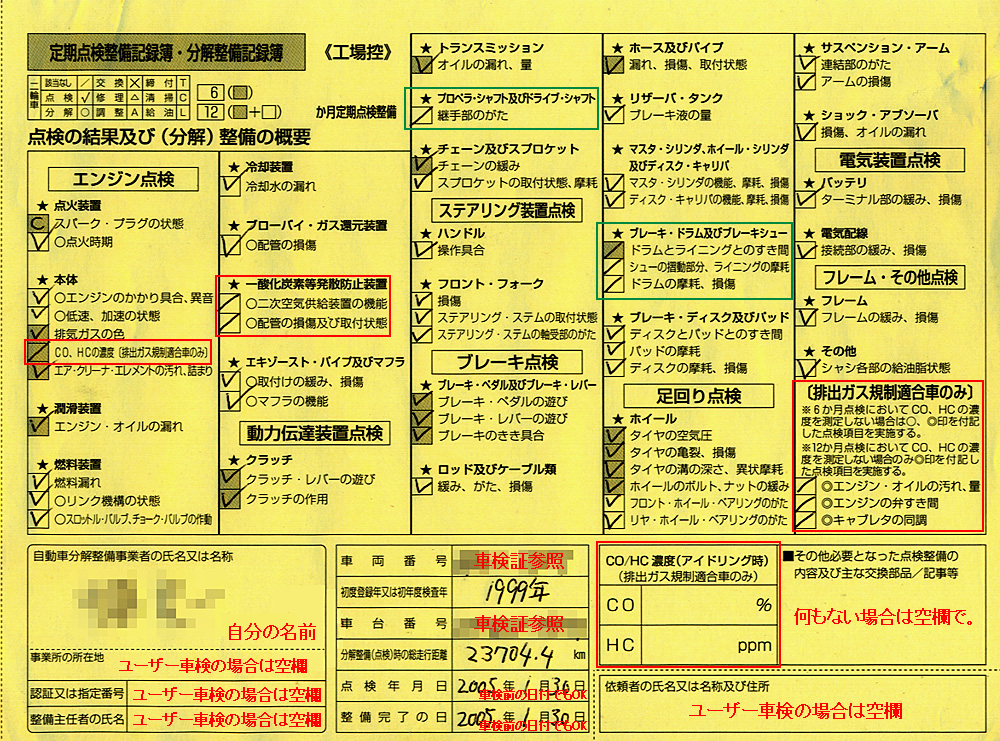 ちなみに、購入時に車検を受けた場合は記録簿があるはずだが、ショップから納車されるときはチェックの入った記録簿は付いてこない (みたい)。