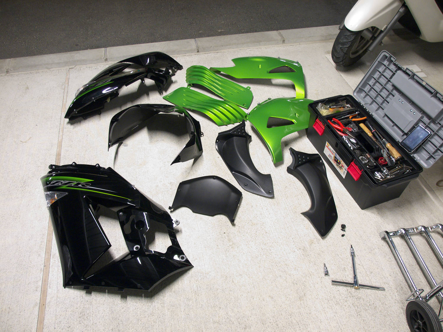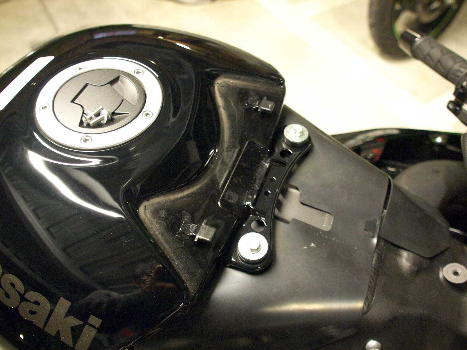 HIDのバラストをサイドカウル裏に入れるためにサイドカウルを剥がすが、そのためにはまず前半部分のほとんどのカウルを外す必要がある。