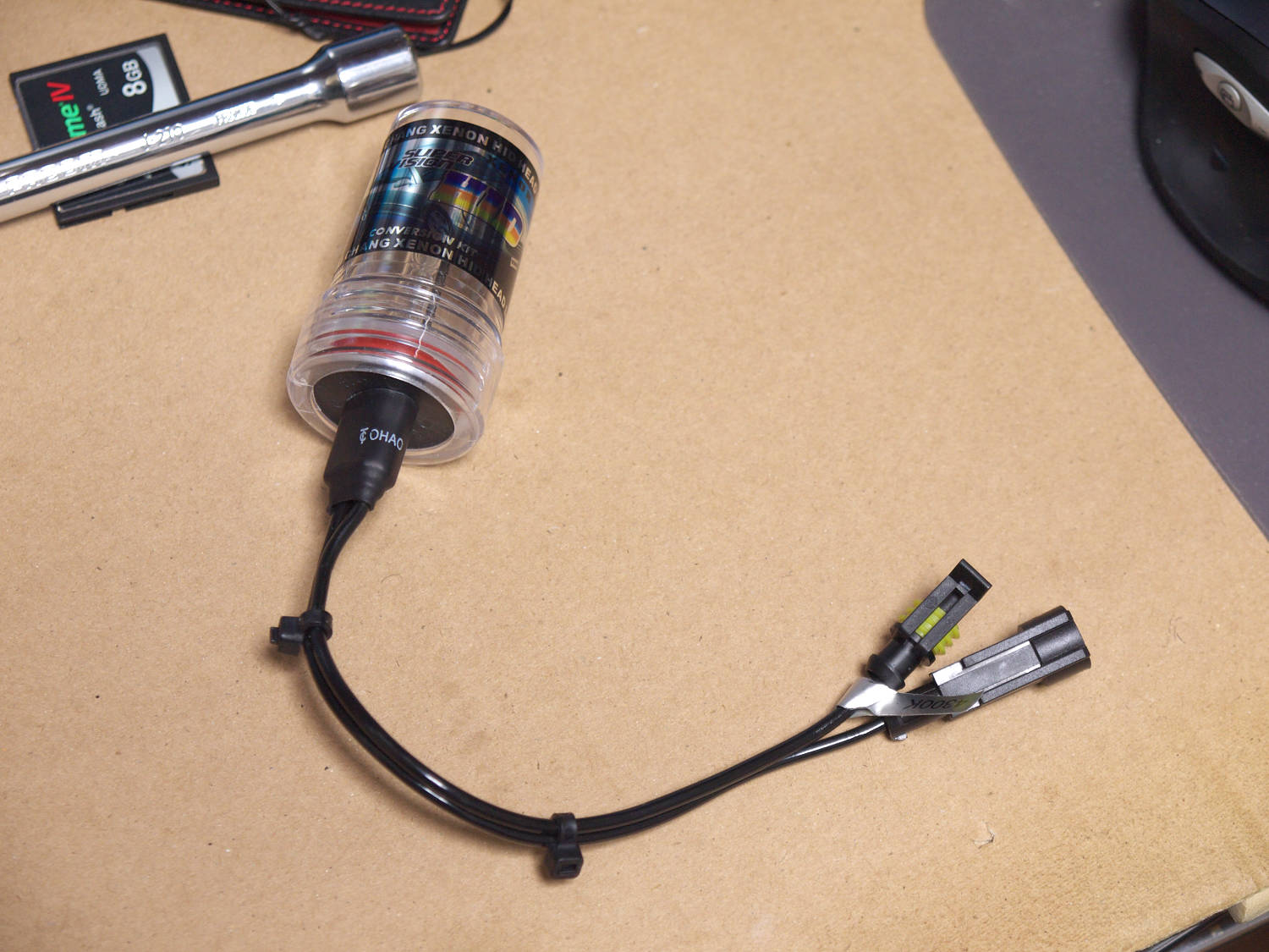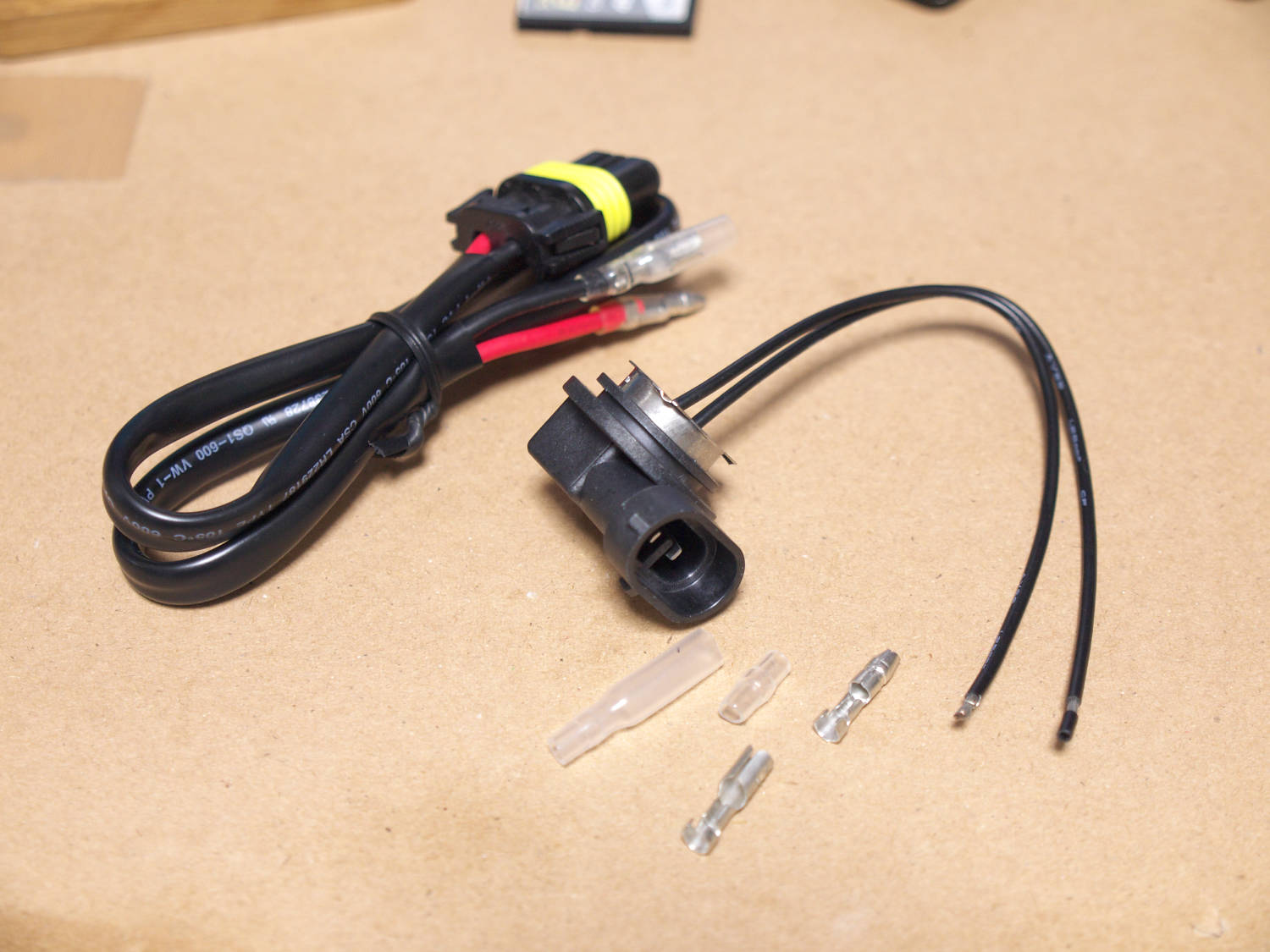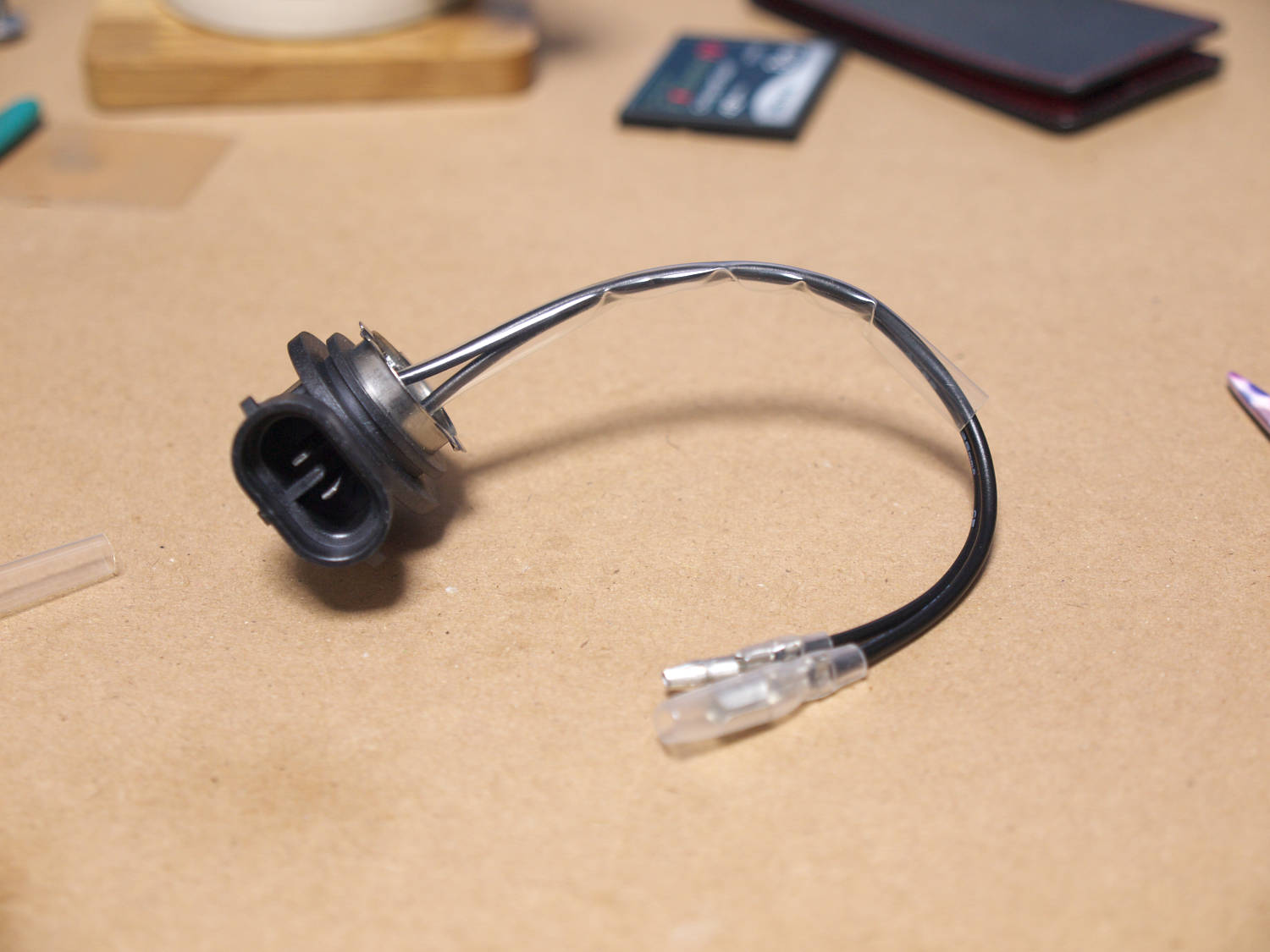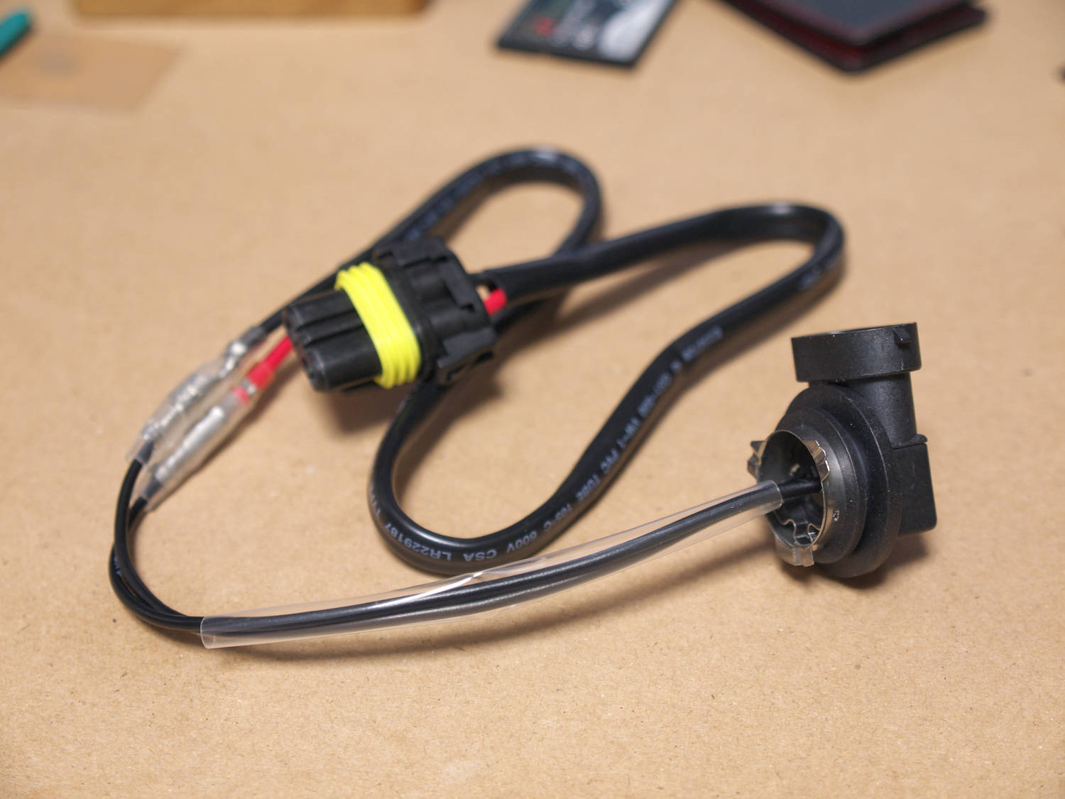 電源はヘッドライトバルブのハーネスから取ることになるが、そのままだとカプラ結合できないのでカプラ結合できるよう加工する。