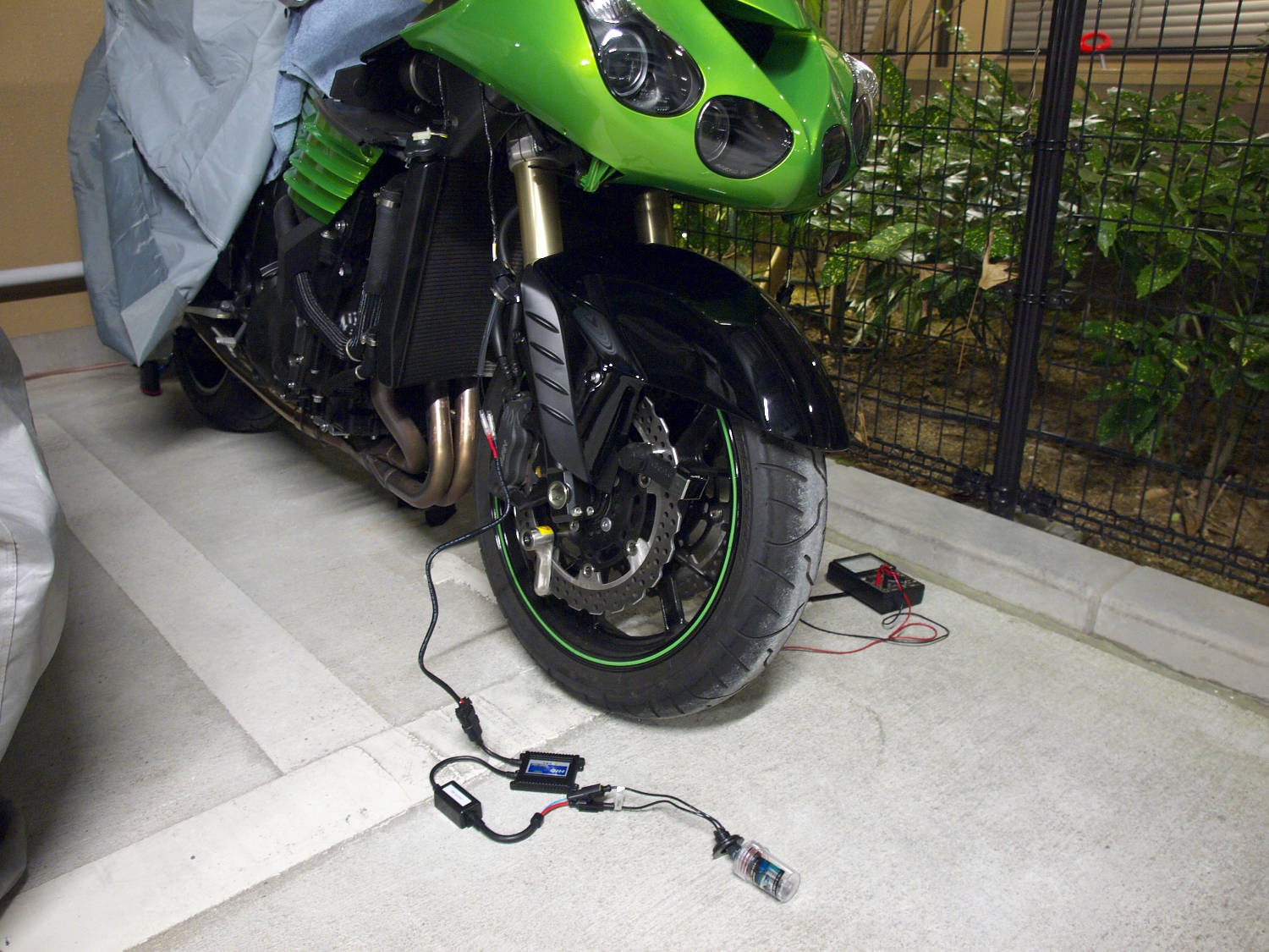 まずはサイドカウルを左腕に通してぶら下げておいてからウインカーカプラーを接続、その後ヘッドライトハーネスをバラストの電源ケーブルと接続する。